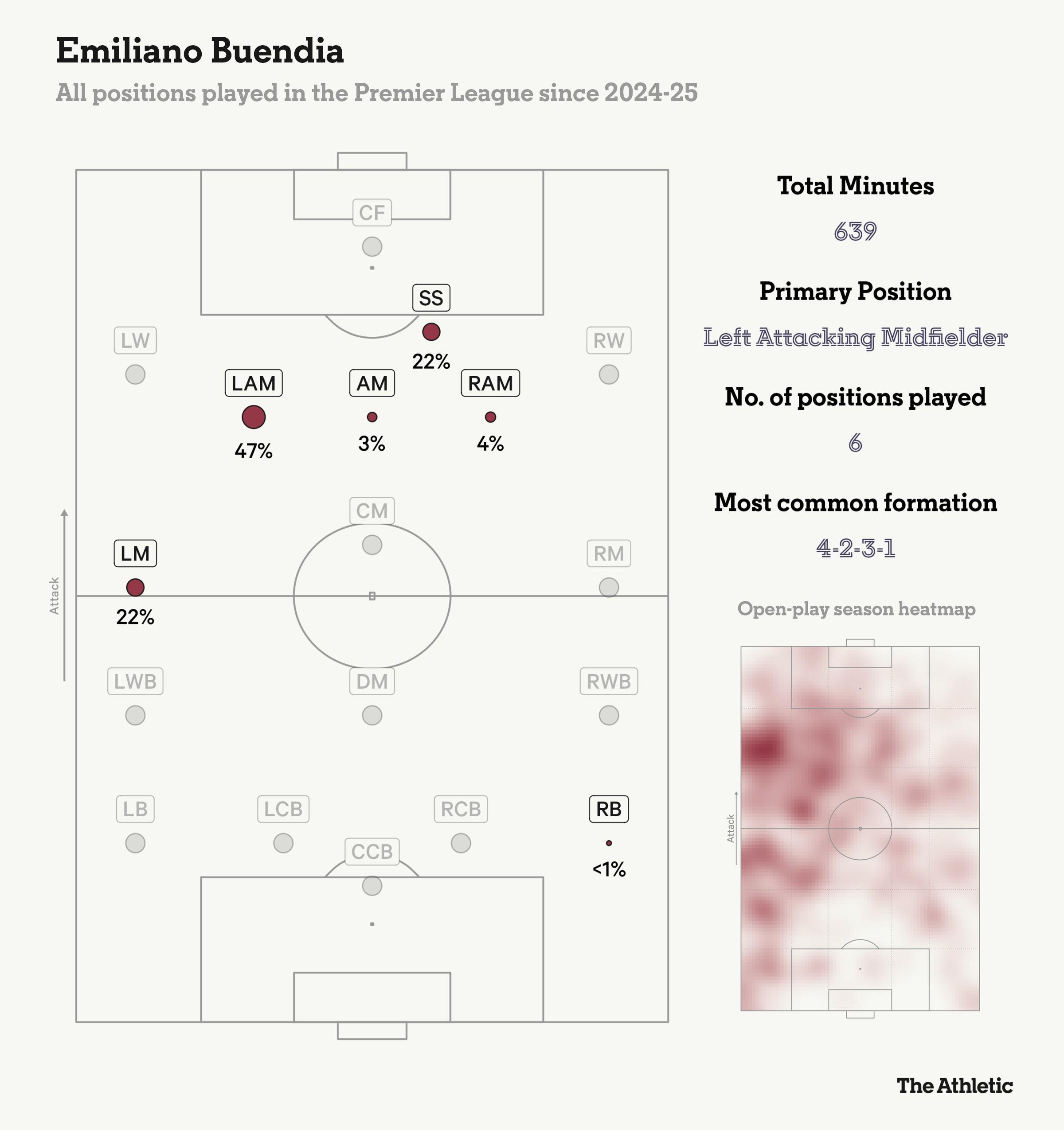 埃梅里的进攻阵型通常以两名内收的10号位球员在防线间活动为特征,边锋也常常扮演隐蔽的第二组织者角色,而非紧抱边线。布恩迪亚在这些中路空当如鱼得水,同时也能与靠近边线的边后卫进行良好配合。