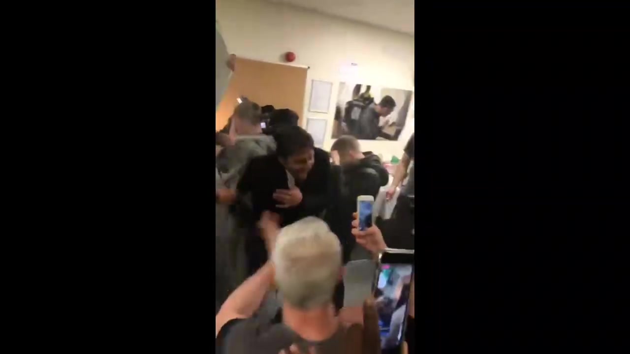 取胜功臣马奎尔接受采访后回到更衣室队友拍头鼓掌欢迎